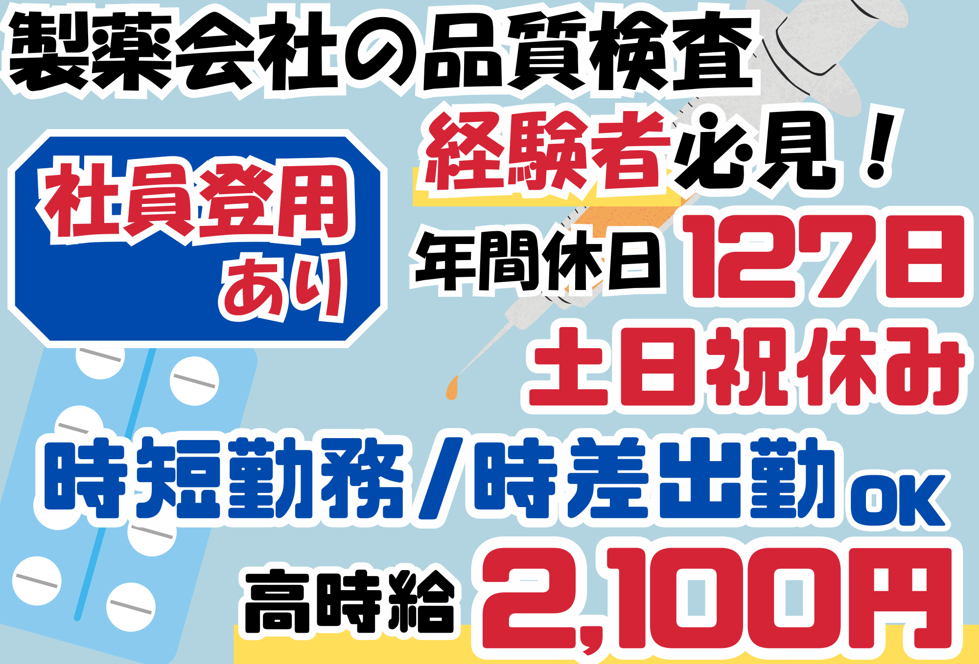 【このお仕事のPoint】 ・年間休日127日。土日祝休みでお休みばっちり ・1時間程度の時短勤務、時差出勤OK ・高時給2100円。休みが多くてもしっかり稼げる 【仕事内容】 ▼医薬品材料の受け入れ検査 発注した内容と納品内容が合っているか確認し、 材料が基準を満たしているかの確認を行います。 ▼錠剤、注射剤の検査 HPLCなどの専用機器を使用して成分の分析を行い、 規格通りの品質かを確認します。 ・3~4名のチーム体制で安心 ・立ち作業・座り作業どちらもあります。 ・社員登用あり(派遣スタートでもキャリアUP可能)。 ・30代、40代、50代の中高年スタッフが活躍中。 ・年間休日120日以上でも、高時給でしっかり稼げる。 【おすすめポイント】 ・土日祝休み。ほぼ平日のみで働けます。 ・夜勤なし/完全日勤のお仕事 ・制服貸与、靴貸与。 ・制服は会社で洗濯するので手間いらず。 ・社員食堂完備(1食410円)。 お昼を用意する必要がありません。 ・1時間程度の時短勤務、時差出勤も相談OK。 ・年間休日125日以上で働きやすい環境。 |