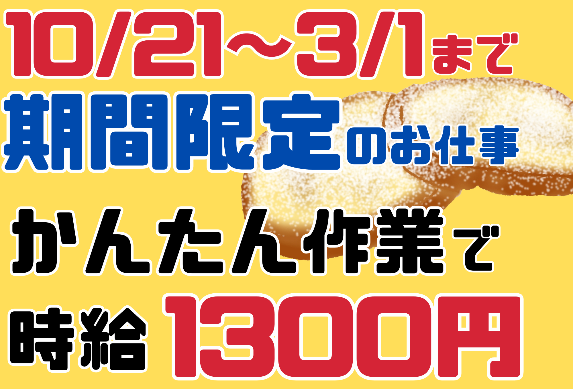 【このお仕事のポイント】 ・期間限定!男女活躍中のお仕事です。 ・簡単作業なので、食品工場未経験OK! ・高時給1300円!高収入を目指せるお仕事です。 【10/21~3/1の期間限定】 お菓子の製造する工場での、期間限定のお仕事です。 友達同士の応募もOK♪ 一つ一つの仕事はとても簡単なので、 食品工場未経験でも始めやすいお仕事です。 【お仕事内容】 ・フランスパンをカットして機械へ入れる ・流れてきた商品の目視検査(不良品を取り除く) ・個包装された商品を並べる ・お菓子を入れる箱を折る ・缶箱を機械にセットする ・箱にいろいろなお菓子を詰める ・賞味期限のチェック ※ライン作業ではないので、じっとしているのが苦手な方にもおすすめ 【職場環境】 ・きれいな工場で働けます ・食堂あり(安くて美味しいご飯が食べられます) ・休憩所にはマッサージチェアも完備 |